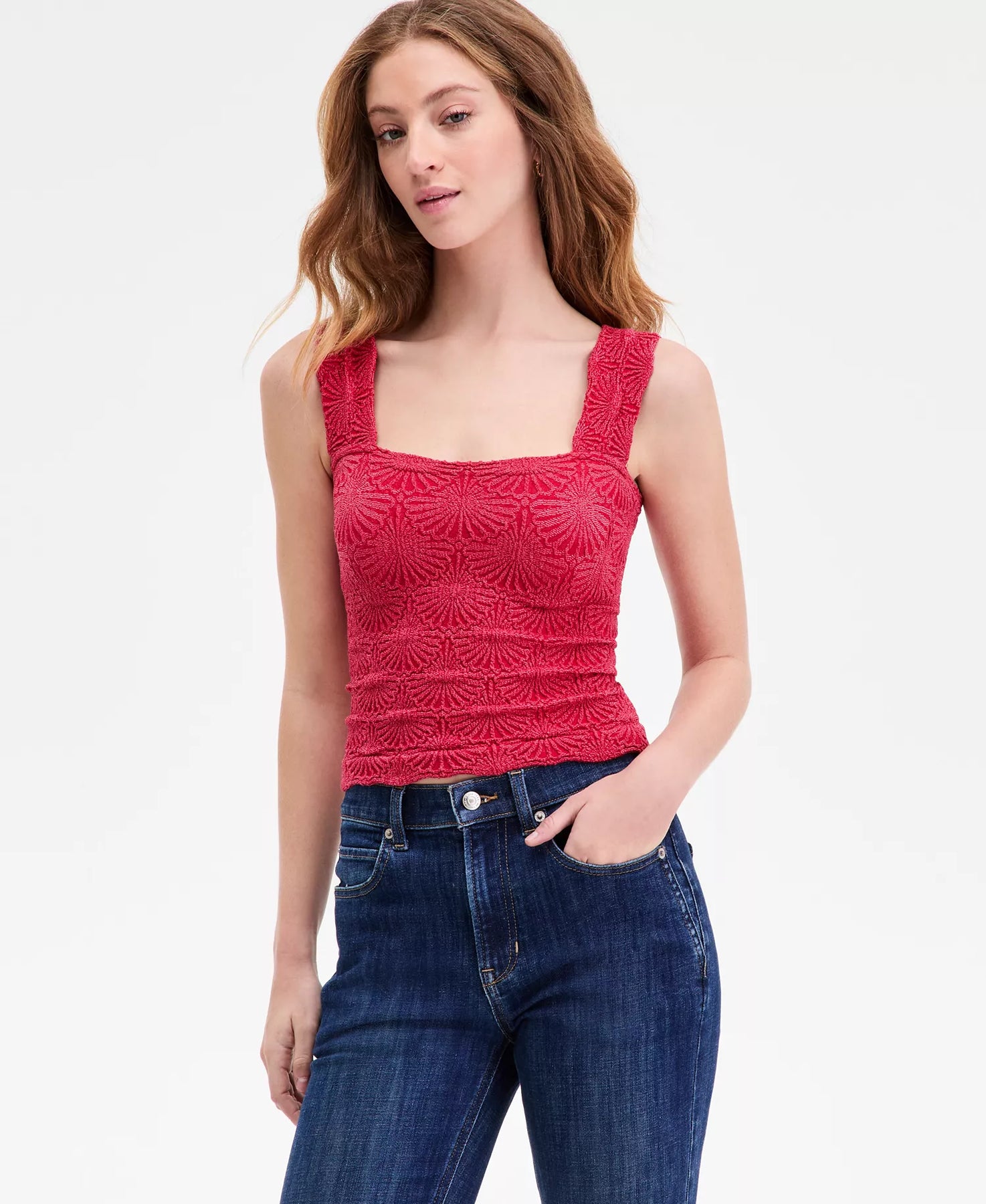 So sweet cami featured in a cropped, square-neck silhouette and jacquard floral design with statement lettuce-edge hemline.