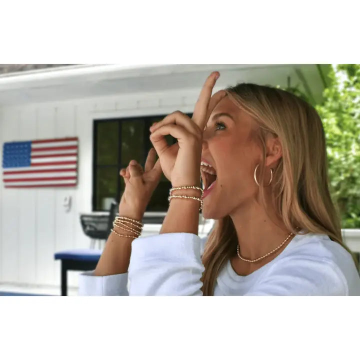 The Charleston bracelets, crafted with waterproof 14k gold-filled beads, are ideal for daily wear. They make thoughtful gifts for graduates, mothers, and friends. Available in two sizes and three elegant styles, they can be worn individually or stacked for a polished look.
