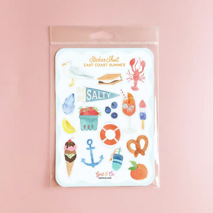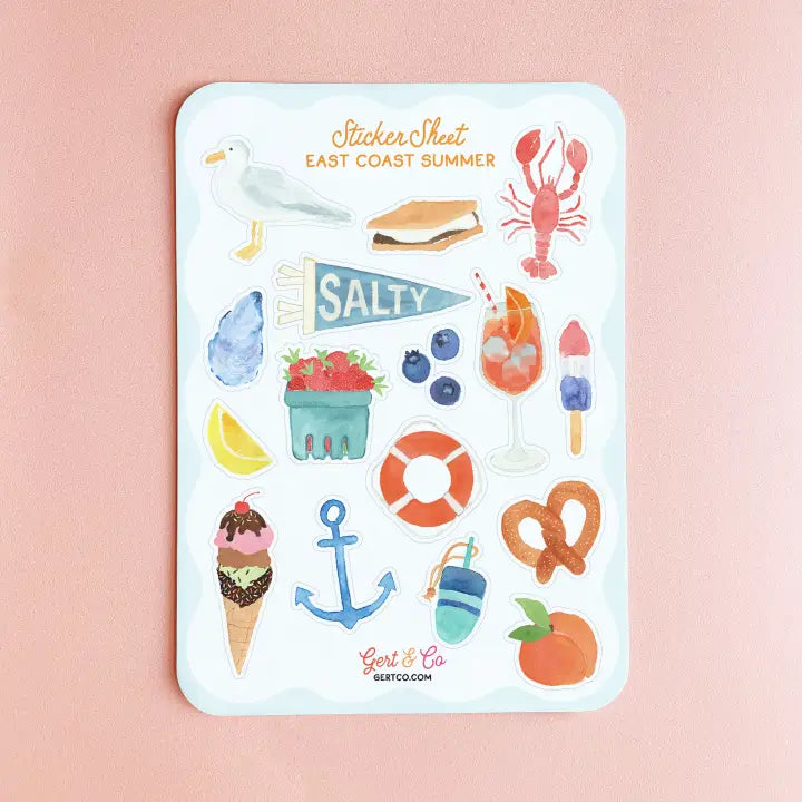 Capture the best parts of summer with this East Coast Summer sticker sheet featuring original watercolor illustrations of seasonal favorites like a lobster, s’more, ice cream cone, Aperol Spritz, and more. Created from durable vinyl that is waterproof & weatherproof, these stickers are a fun way to bring coastal vibes to notebooks, water bottles, or wherever you want to celebrate East Coast pride.