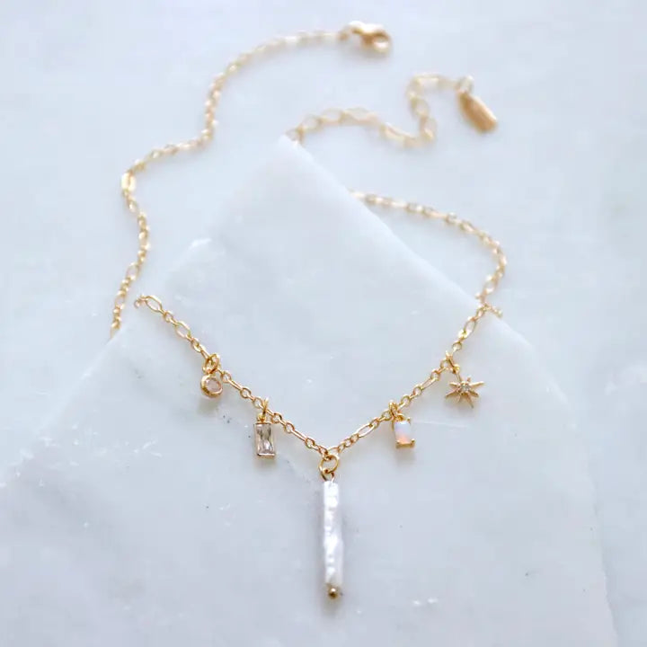Pearl, Opal, CZ Charm Necklace  Details: • MATERIAL: 18K gold plated over brass, opal, CZ, pearl, freshwater pearls • CHAIN LENGTH: 17" + 2" extender chain • CLASP STYLE: Lobster